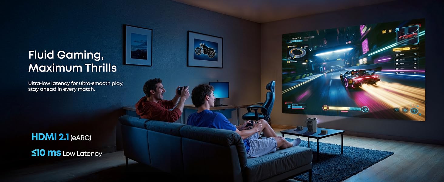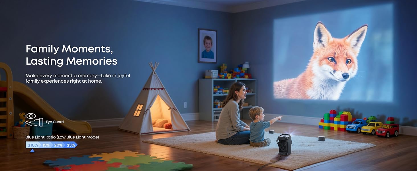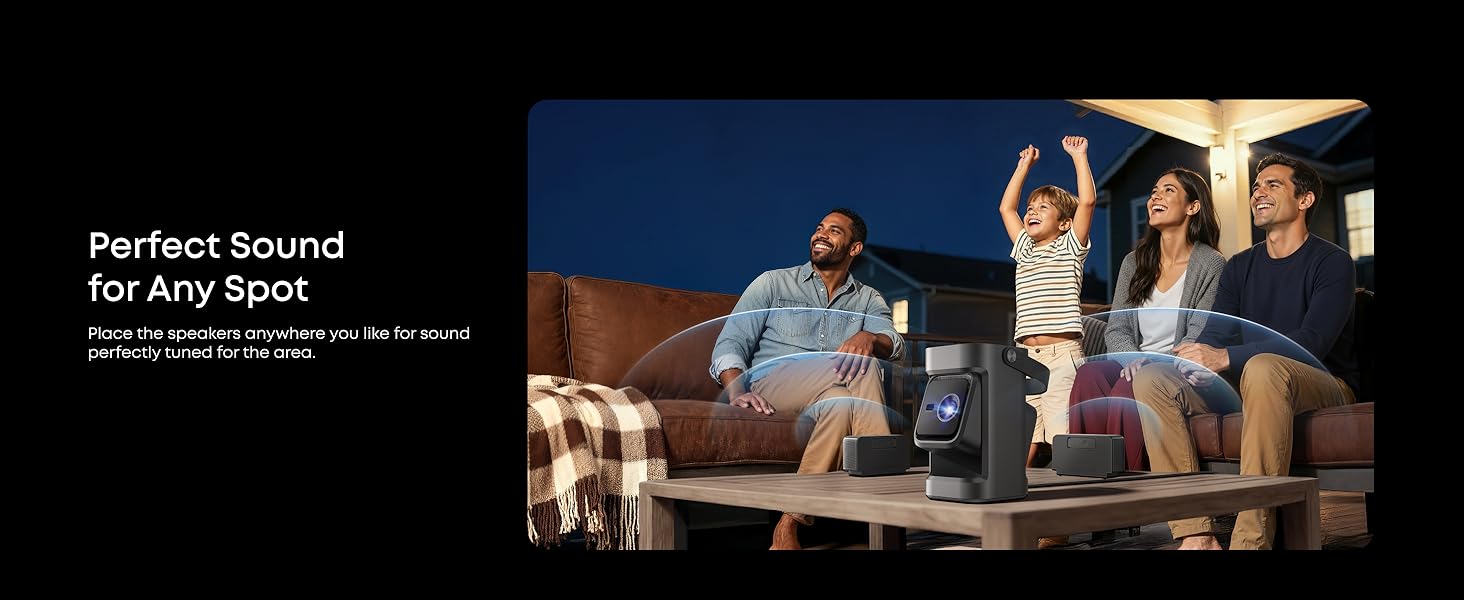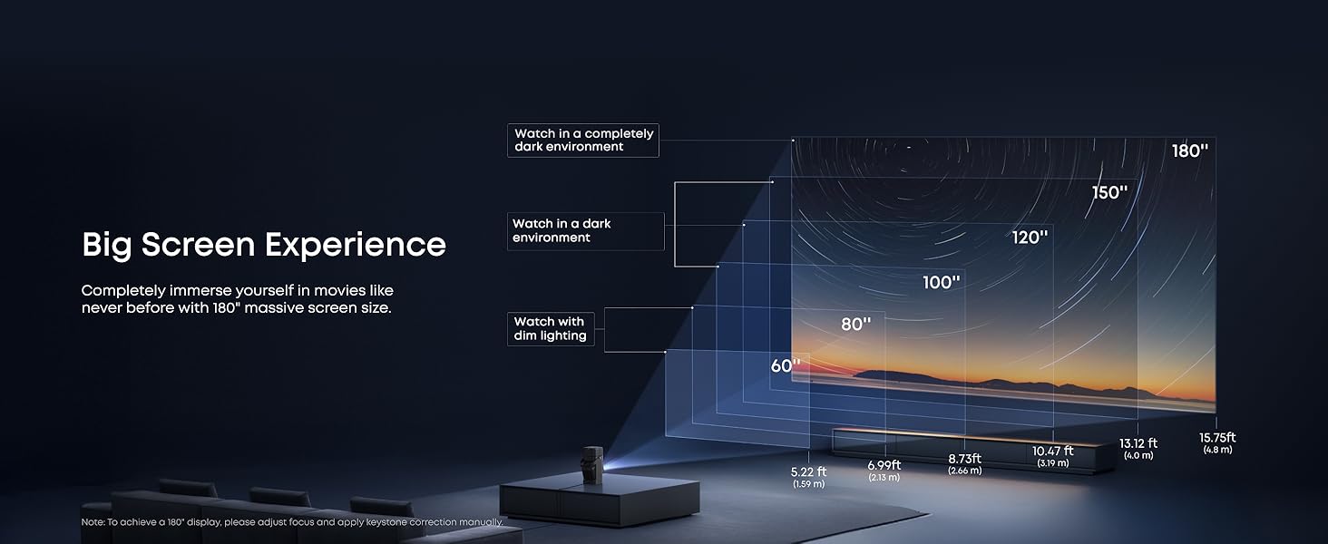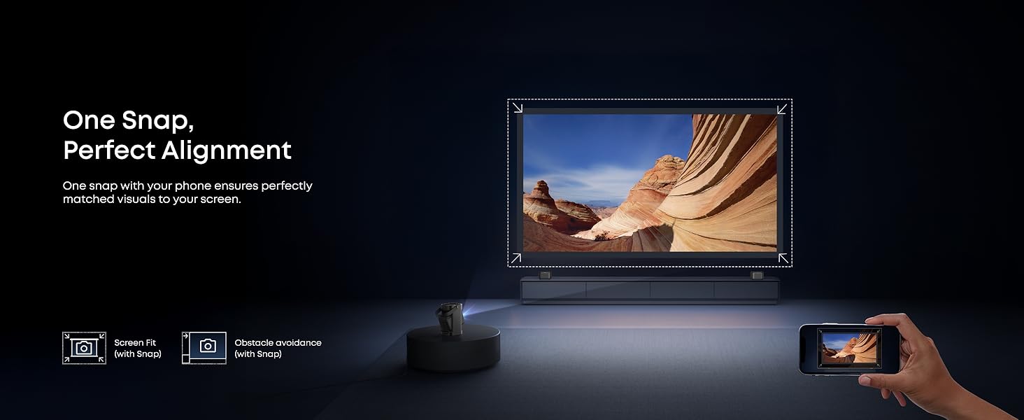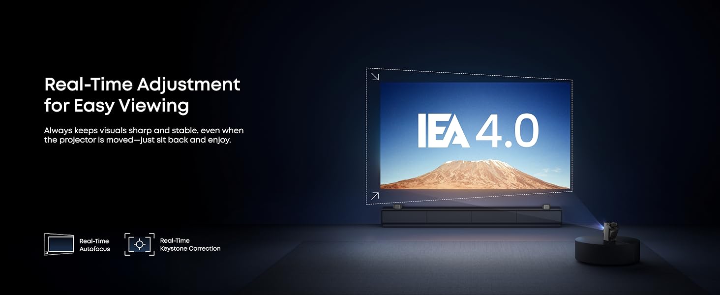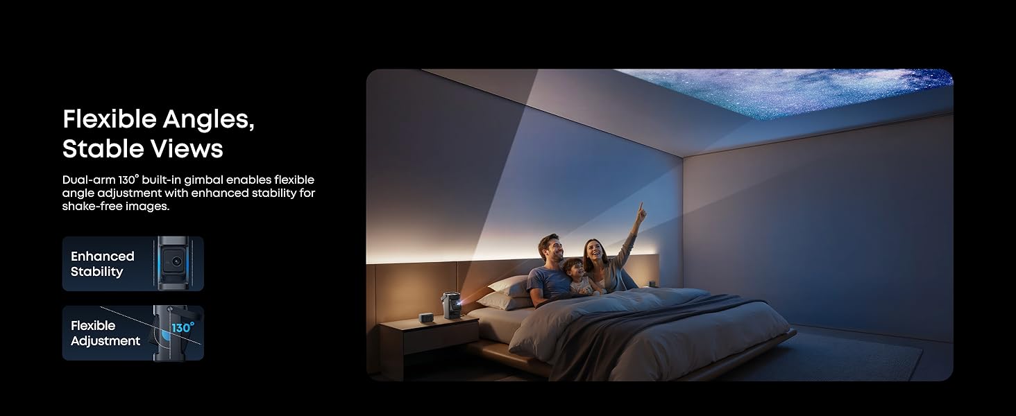 Effortless Viewing with Instant Adjustment: With real-time autofocus and keystone correction, pictures are perfectly aligned even when moved. Dual-arm 130° built-in gimbal enables flexible angle adjustment with enhanced stability for shake-free images.