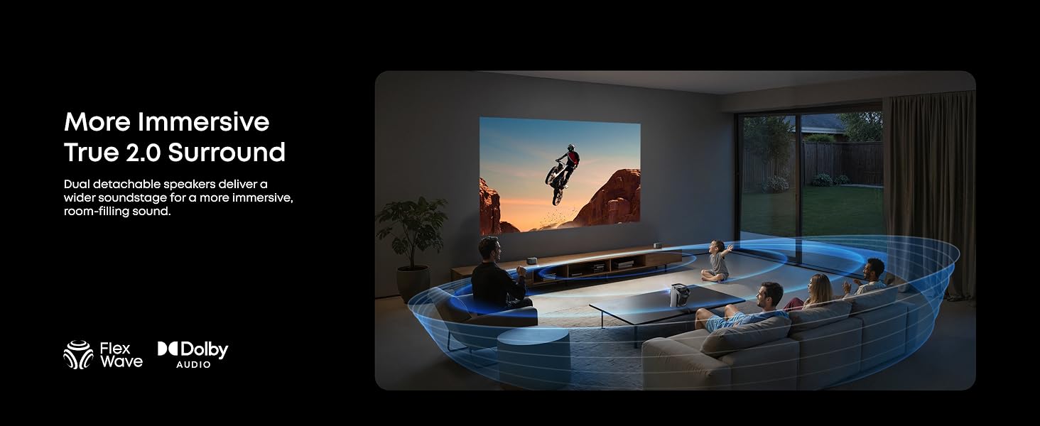 More Immersive True 2.0 Surround Sound: Dual detachable speakers deliver a wider soundstage for a more room‑filling, immersive sound. Flexibly place the speakers anywhere you like for sound perfectly tuned to your spot.
